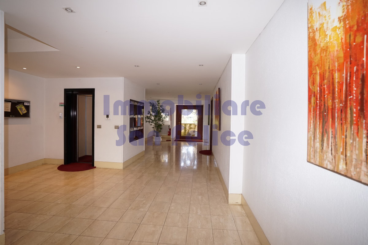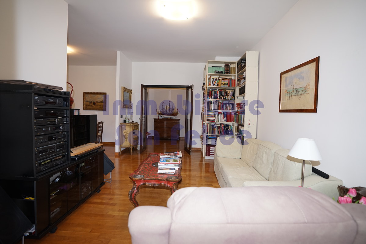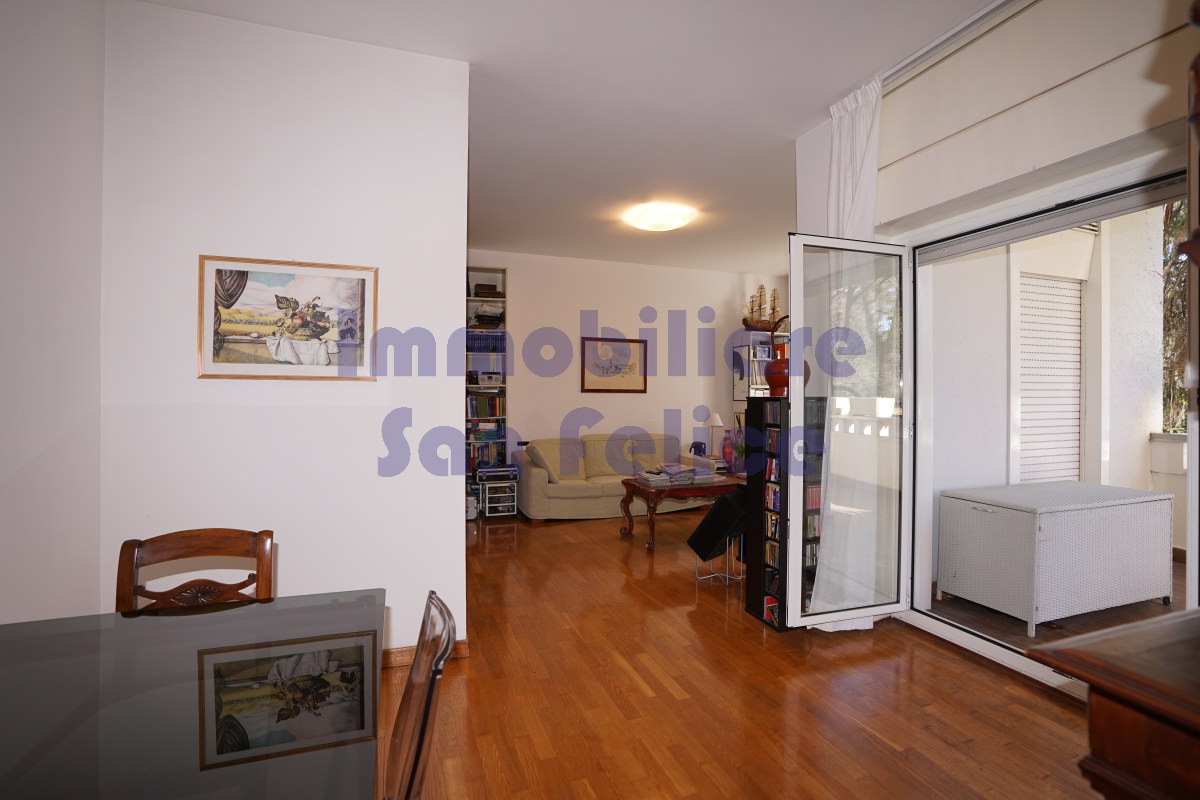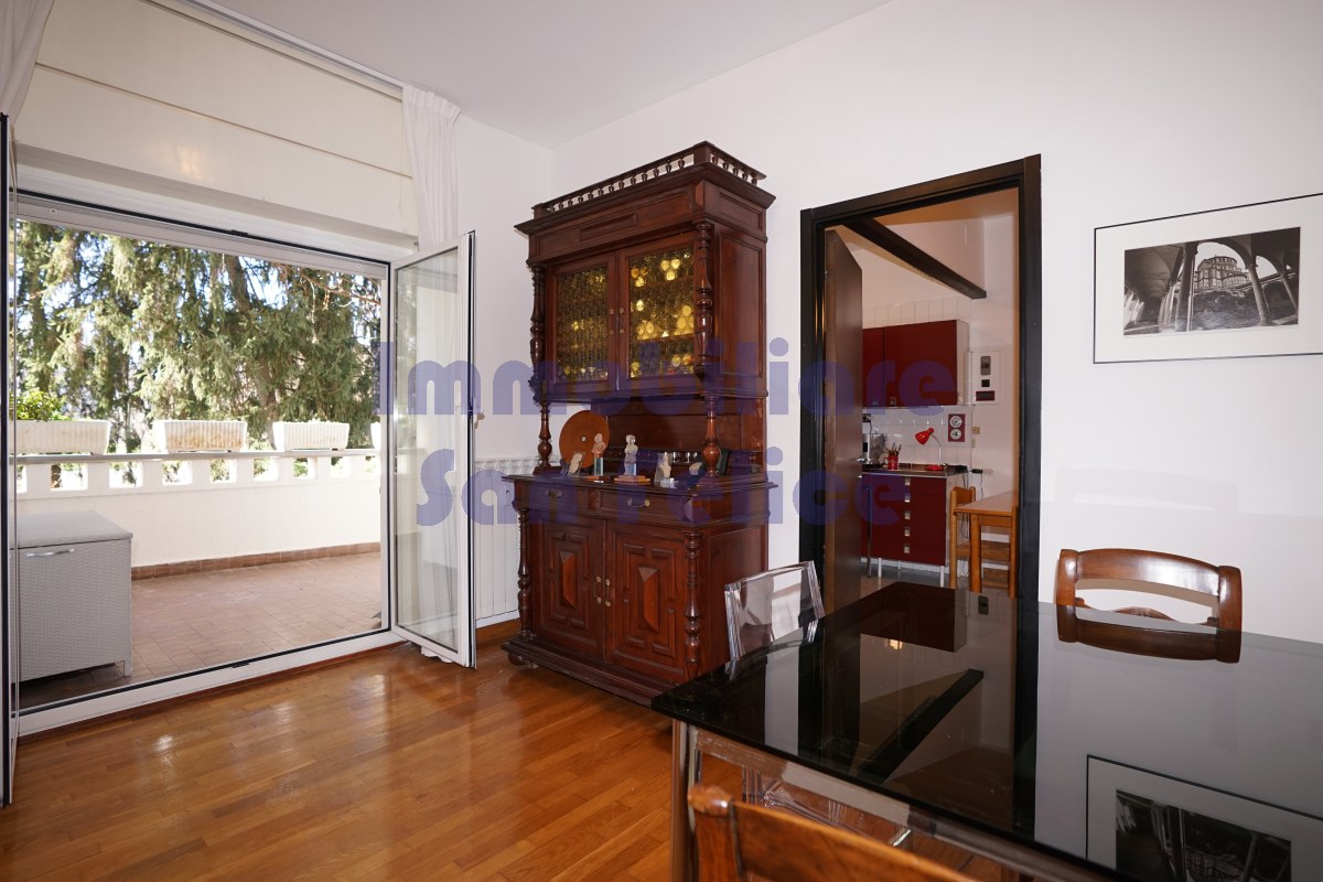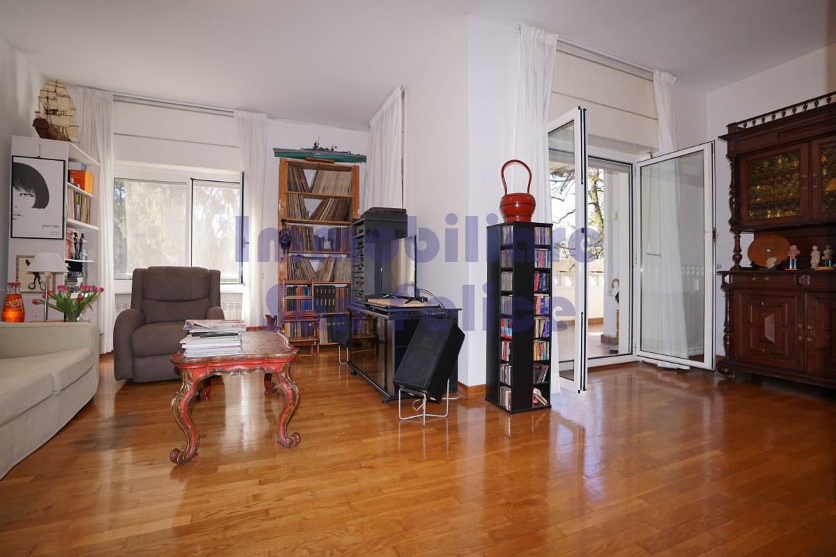 L’ingresso conduce a un ampio salone doppio, con accesso diretto al terrazzo di circa 10 mq, parzialmente coperto, con piacevole e riservata vista sul parco.