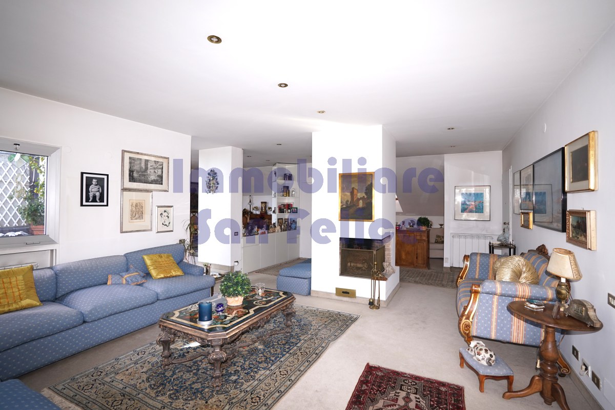 - ingresso che si apre su un grande soggiorno suddiviso in tre zone distinte: area TV con lucernario, zona salotto con camino e zona pranzo. L’ambiente gode di doppio accesso ai due terrazzi a tasca, ideali per momenti di relax all’aperto. La cucina è a vista nella zona giorno e adiacente si trova un ripostiglio.